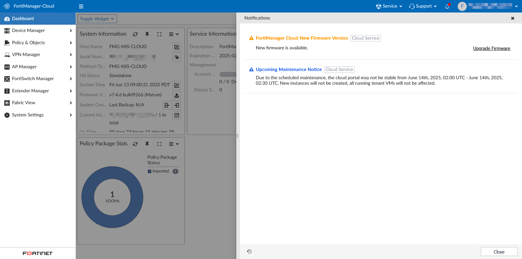 Administrators can perform firmware upgrades from within the FortiManager Cloud Dashboard or notification drawer. An administrator with Super_User permissions is required to perform the upgrade. |
