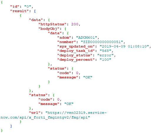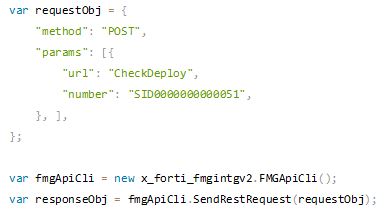 This section shows the format to construct the “request object” and then use FMGApiCli.SendRestRequest(obj) to send the request. FortiManager Integration App returns a response to caller.