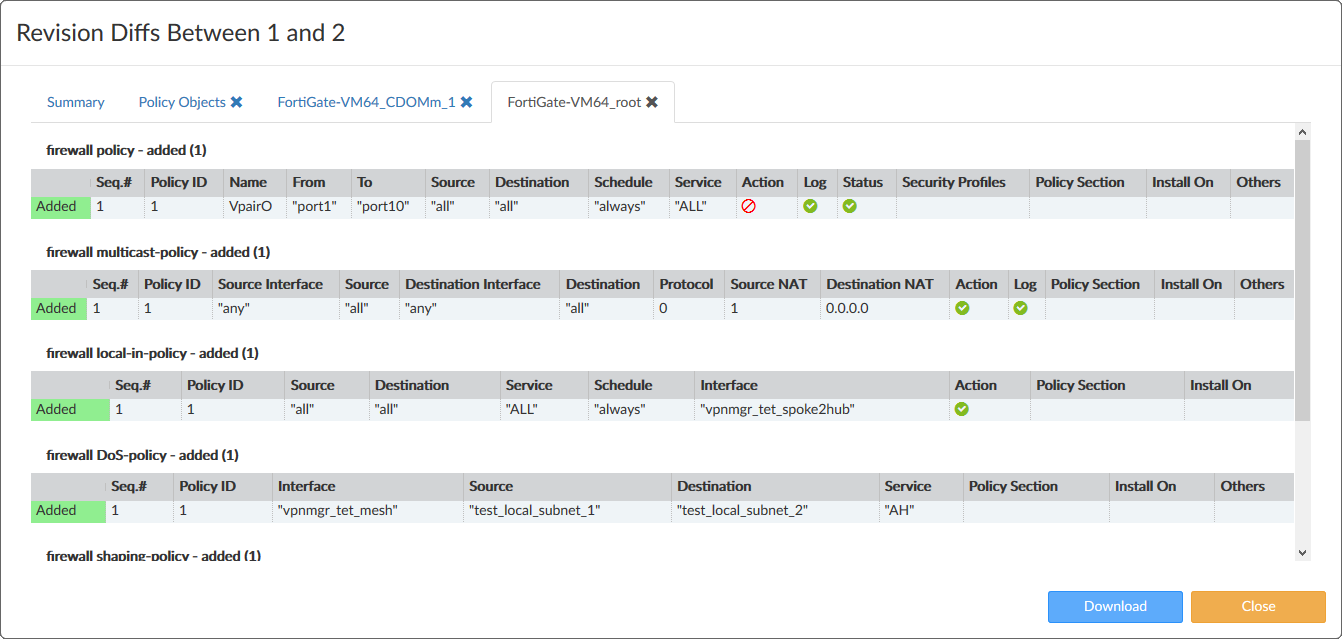 - Select Details to view specific changes within a policy package or the policy objects.