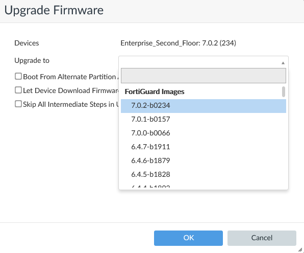 It is recommended to also check that the upgrade path for FortiGate reported by FortiManager matches the upgrade path reported on the Fortinet Customer Service and Support site for the FortiGate device.