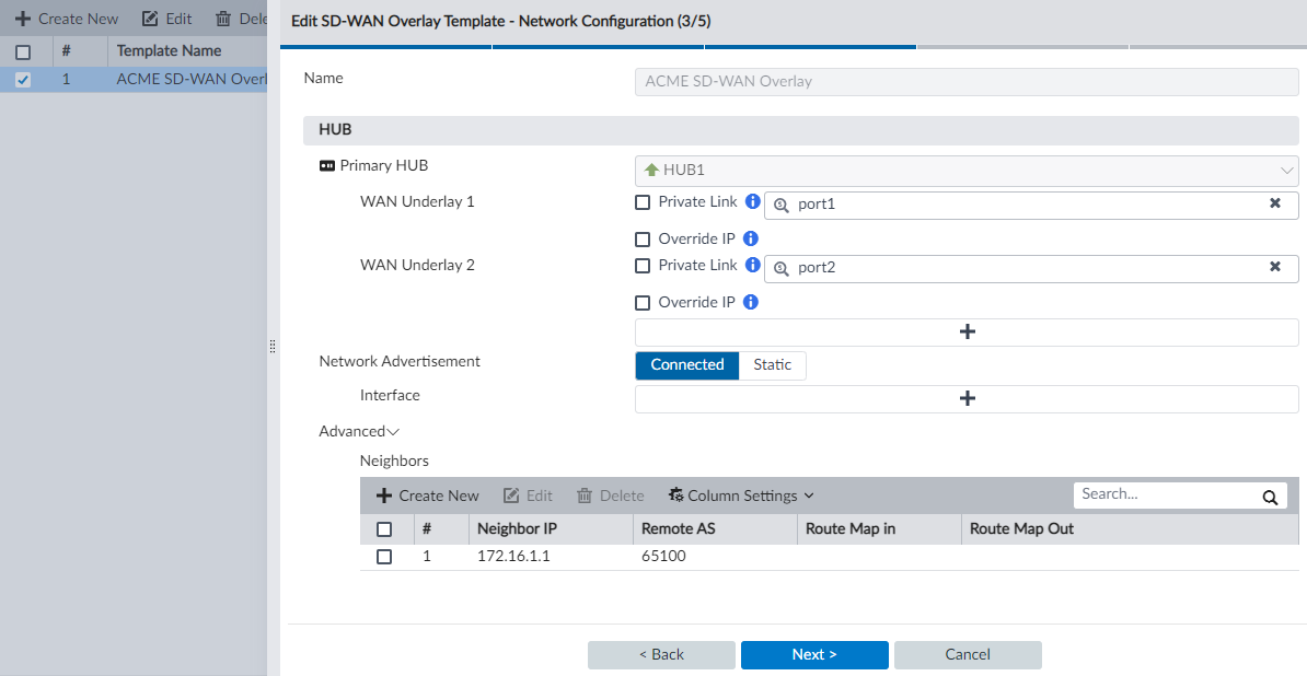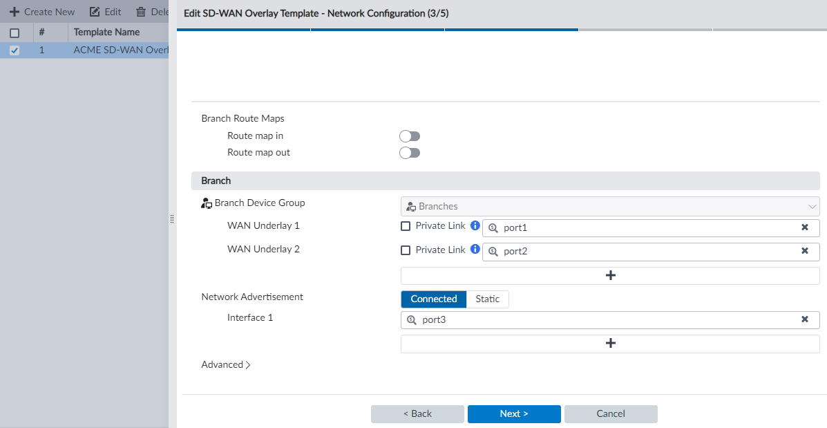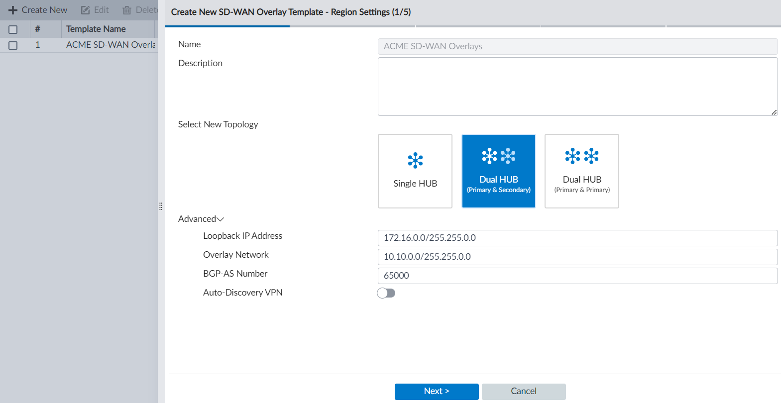 - Expand Advanced, and modify the default IP address scheme for loopback and overlay networks, BGP-AS number, and to enable AD-VPN as desired.