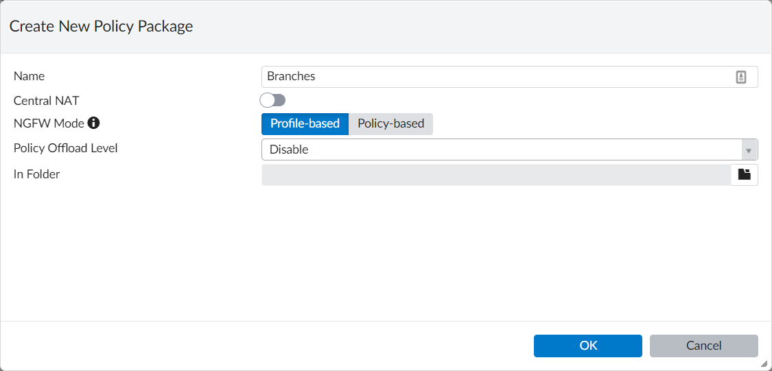 - Create a policy package for branch devices. See Creating the branch policy package and policies.