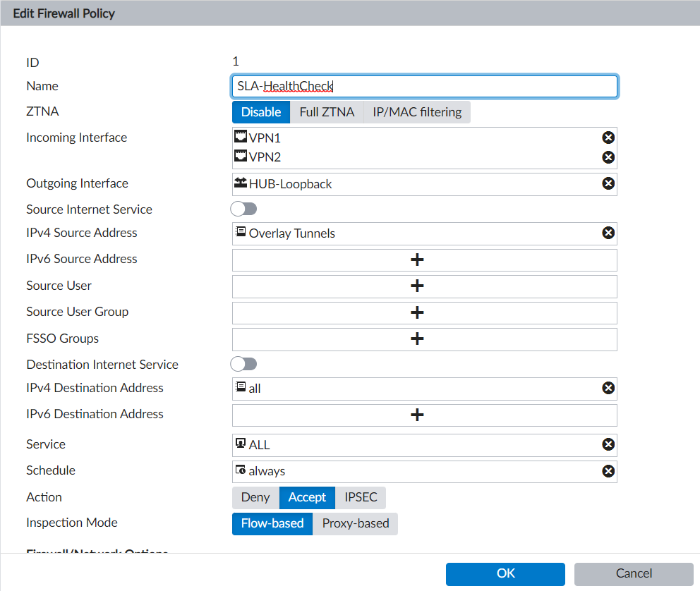 - In the HUB policy package, create a firewall policy named SLA-HealthCheck :