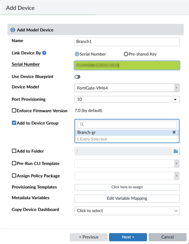 In this example, Port Provisioning is configured as 10. FortiManager will create 10 ports for this FortiGate-VM. - Enable Add to Device Group, and select the previously configured Branch-gr device group.