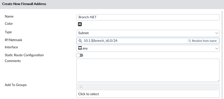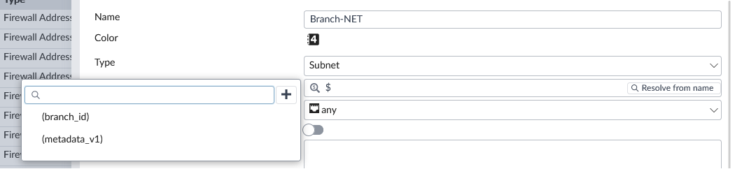 - For firewall addresses (subnet type), you can use metadata variables in the IP/Netmask field.