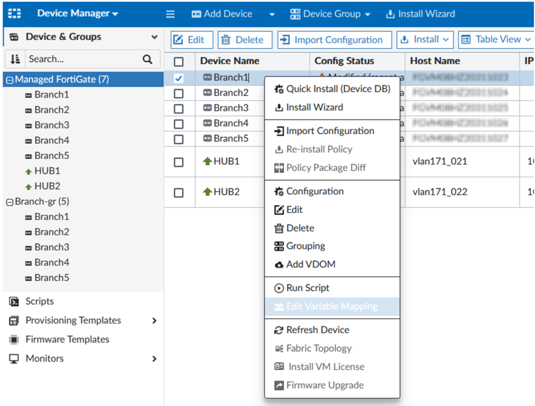 - Go to Device Manager > Device & Groups, right-click a device in the device table, and select Edit Variable Mapping.