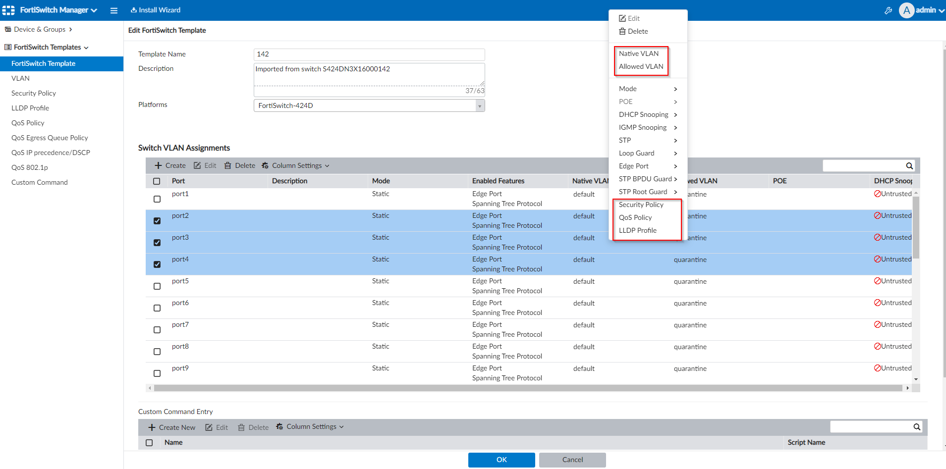 - Edit a FortiSwitch Template, select the ports, and right-click to see the context menu.