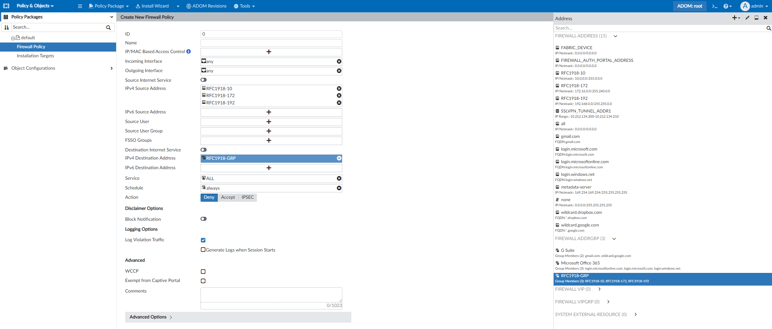 You can select the firewall address objects for use in the policy. For example, the RFC1918-GRP address group object is selectable as an IPv4 Destination Address.