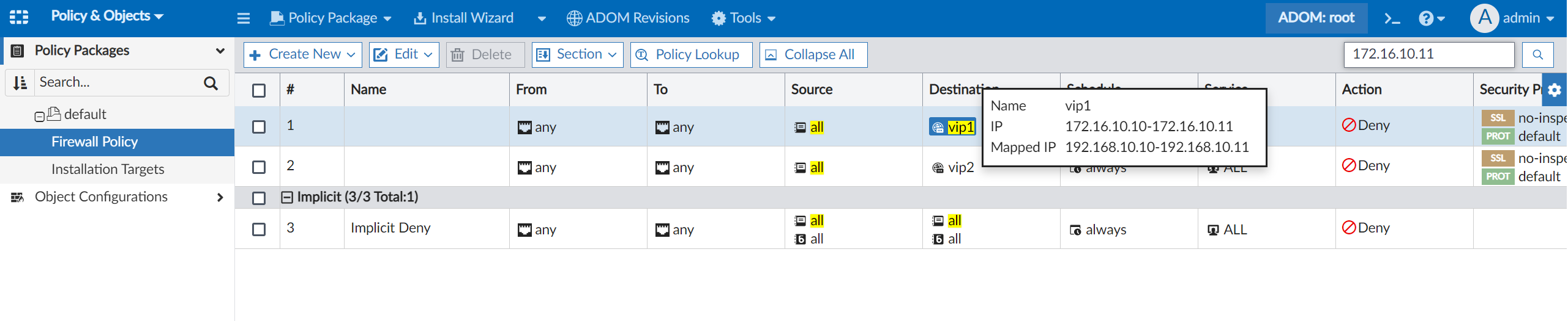 - In the Firewall Policy search field, search for the first or last IP in the VIP range.