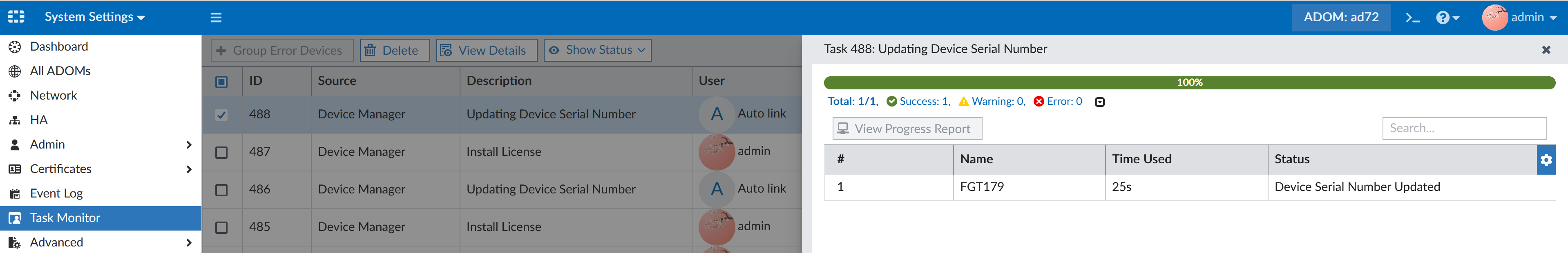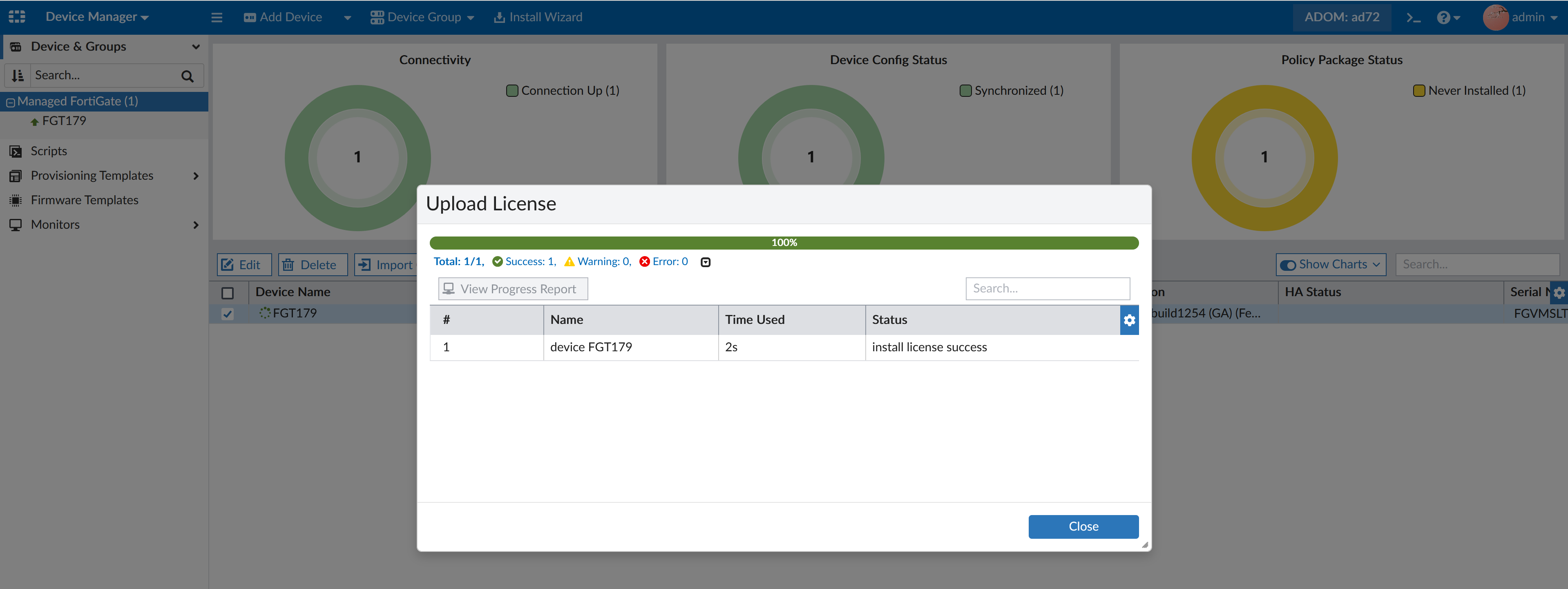FortiManager will upload the license and update the Serial Number for the FortiGate device. The FortiGate license is replaced with the new license.