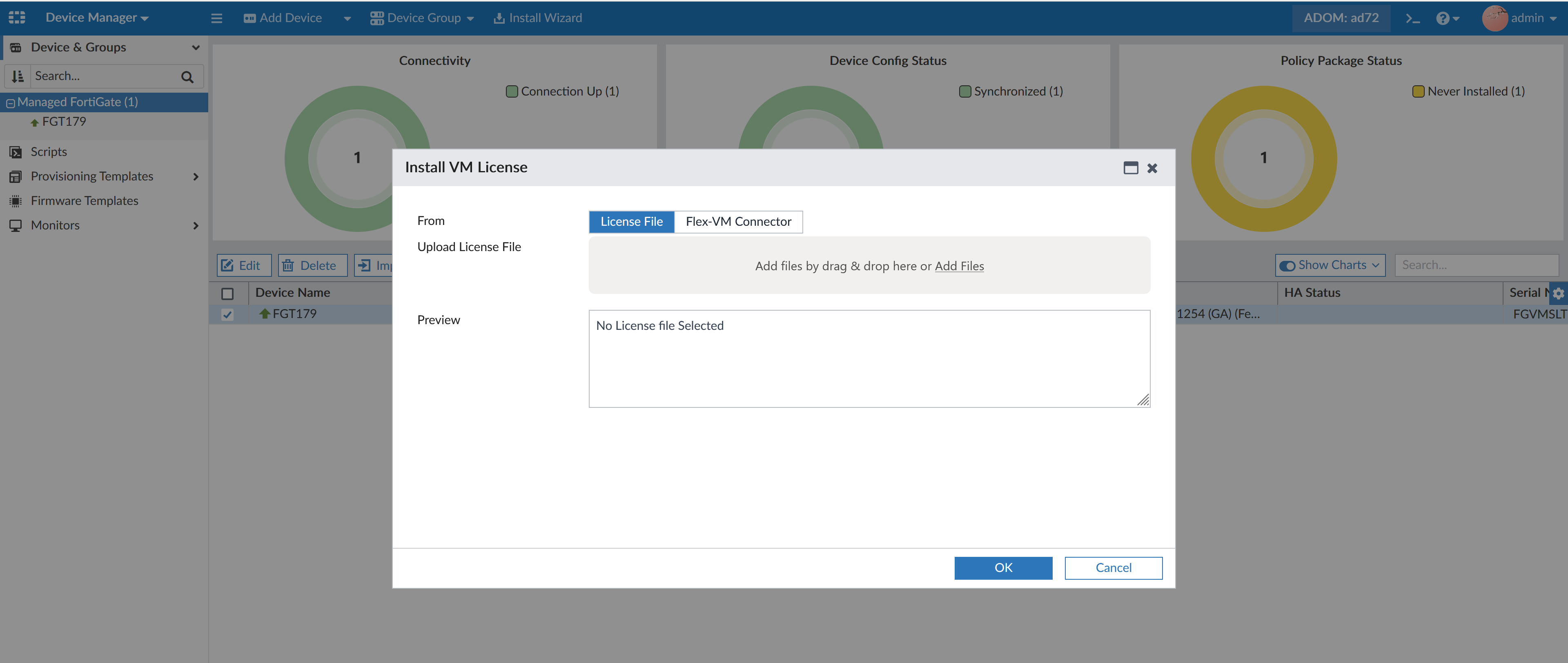 FortiManager supports BYOL installation on managed FortiGate VM 7.2.1