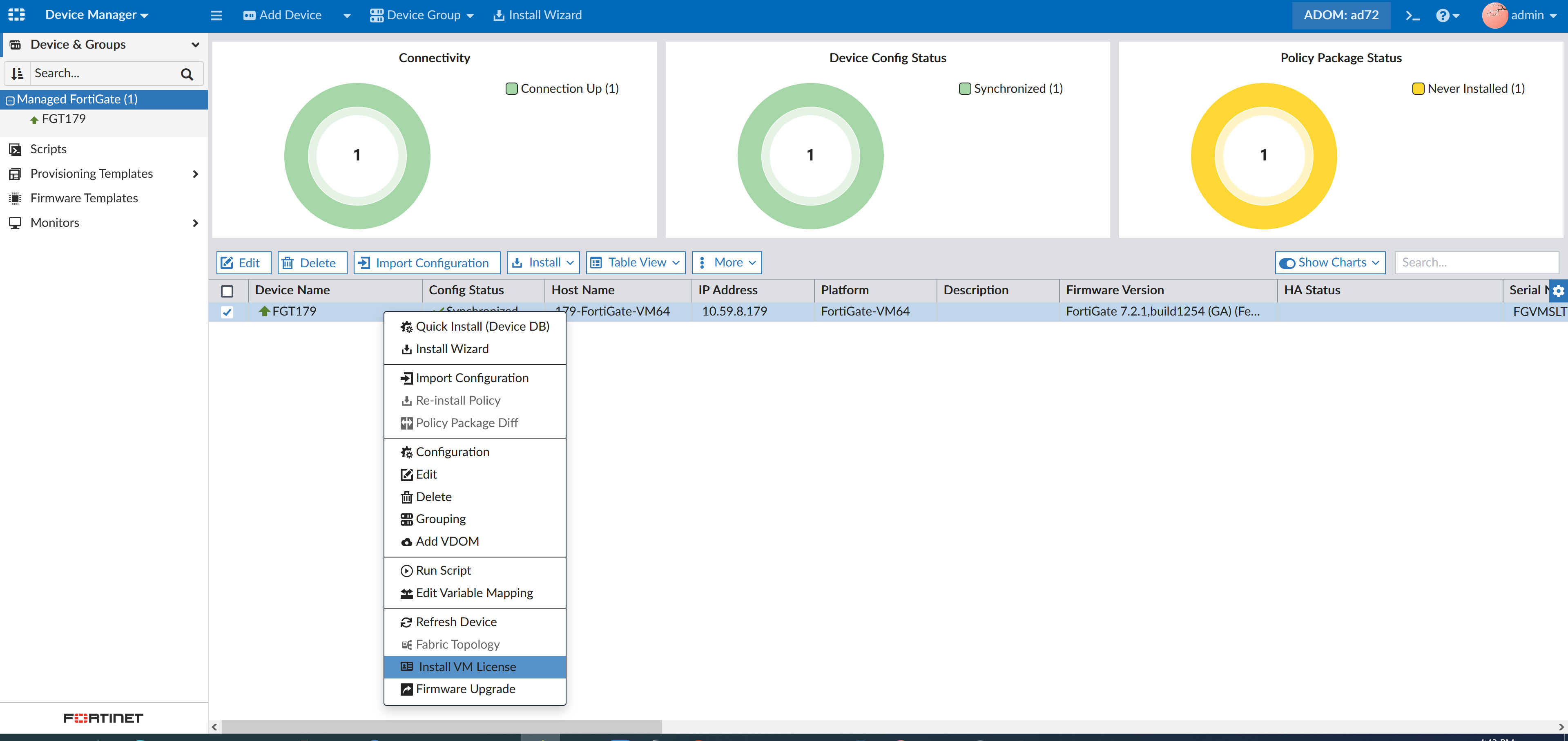 - Right click on a managed FortiGate VM, and select Install VM License from the dropdown menu.