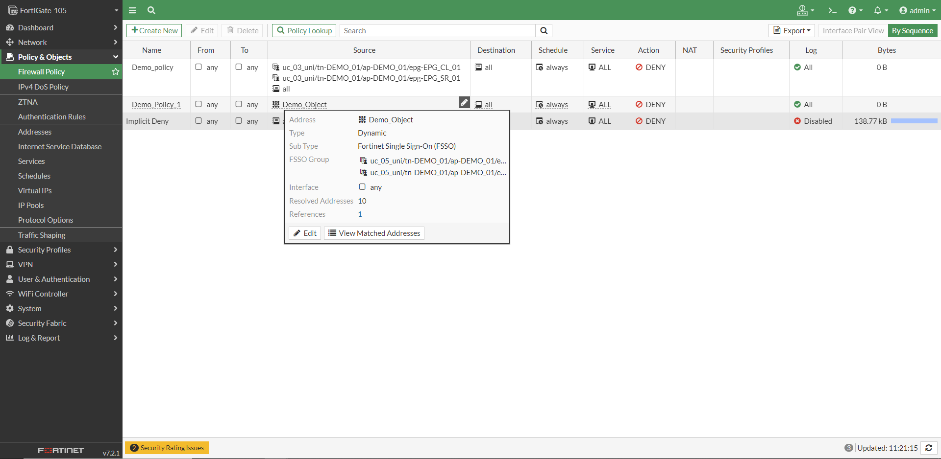 - If the EPGs are in use in Policy and or Address Objects, these FSSO groups will be stuck on FortiManager. Administrators will need to make sure that all the EPG groups in use should be deleted before deleting the connector.