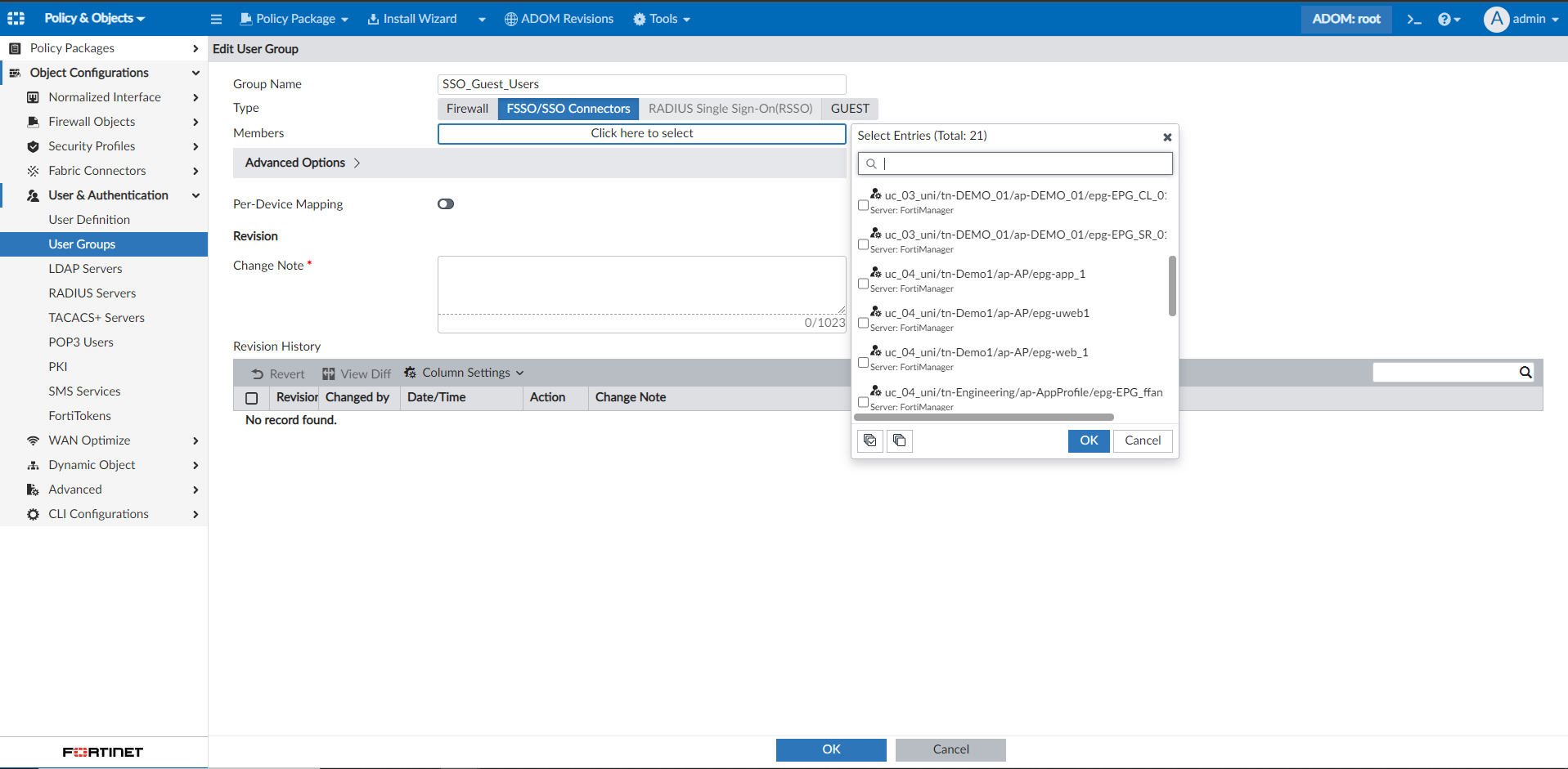 FortiManager will retrieve all the corresponding EPGs and the IP address information from the Cisco ACI server.