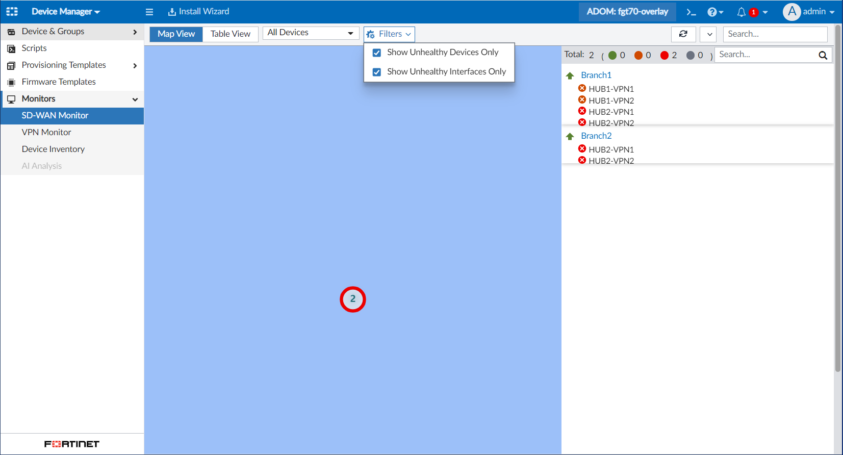 SD-WAN Monitor includes new filter to display unhealthy devices or interfaces only 7.2.1