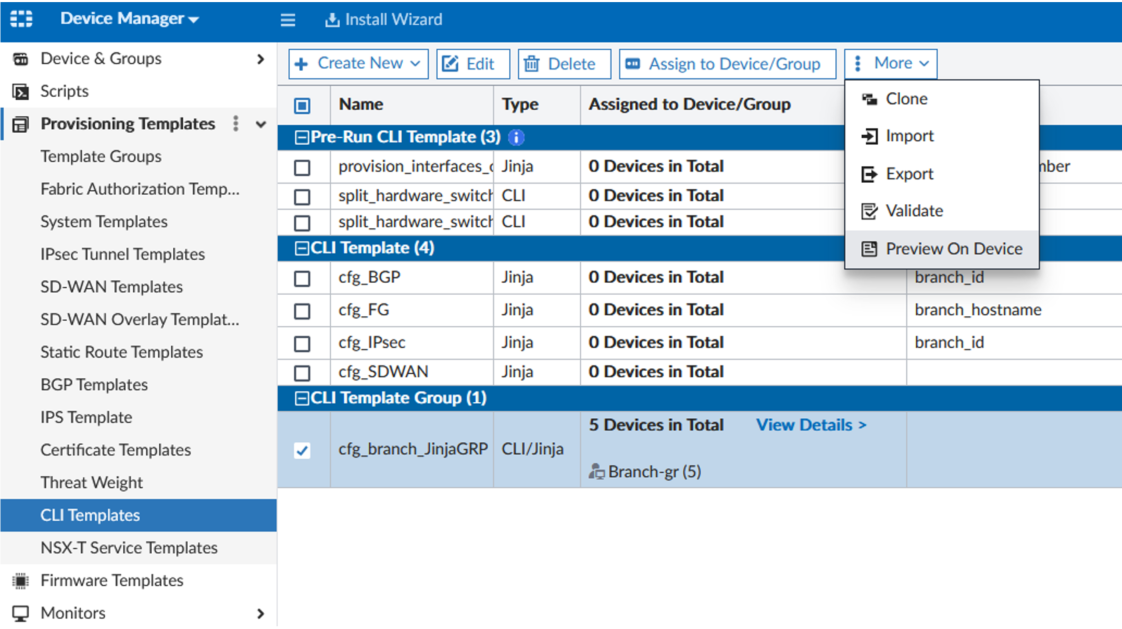 You can preview the Jinja script on a FortiGate device or device group to view the rendered Jinja script contents. If everything looks correct, you can then perform the installation to apply the template to the device.