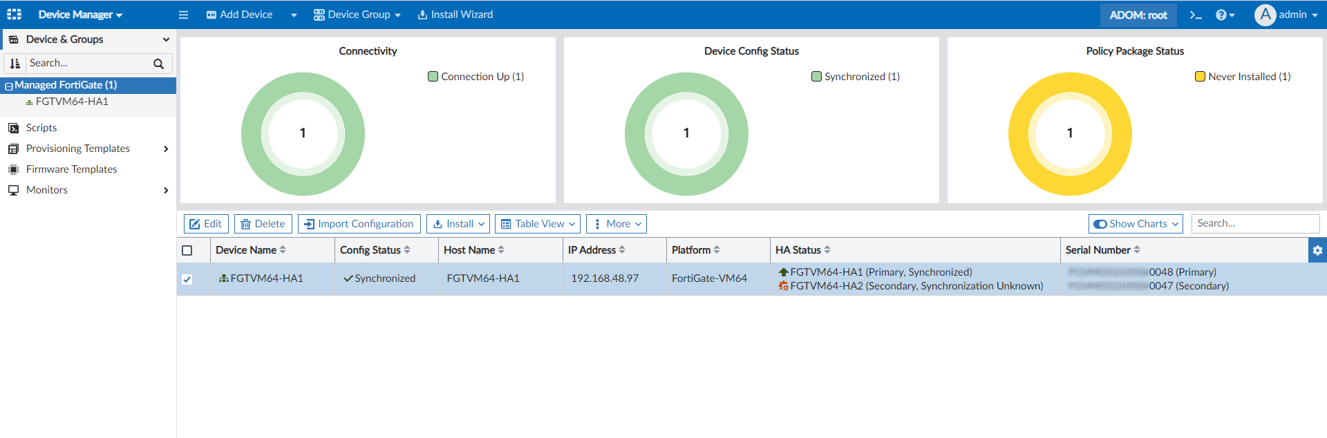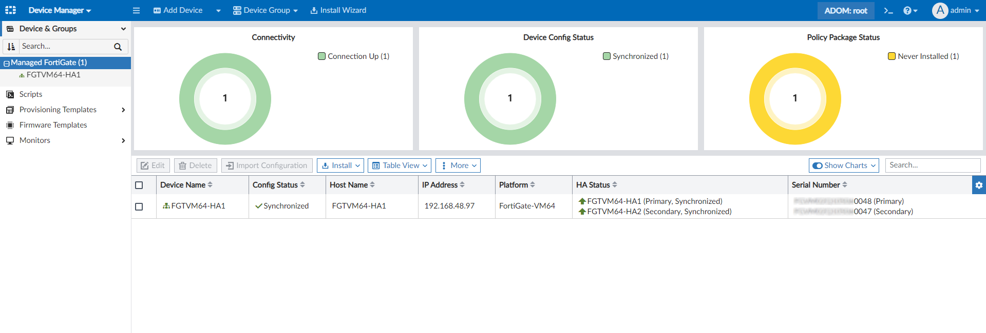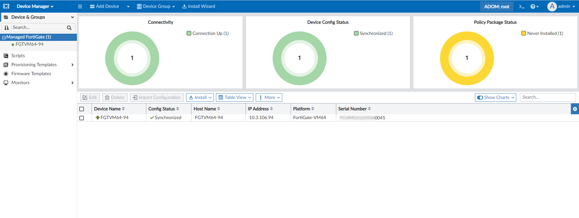 - Go to the FortiManager Device Manager and select Managed FortiGate.