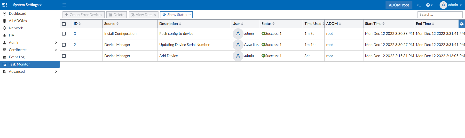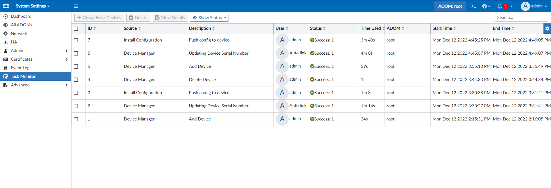 - FortiManager will update the device serial number and push the configuration to the new device.