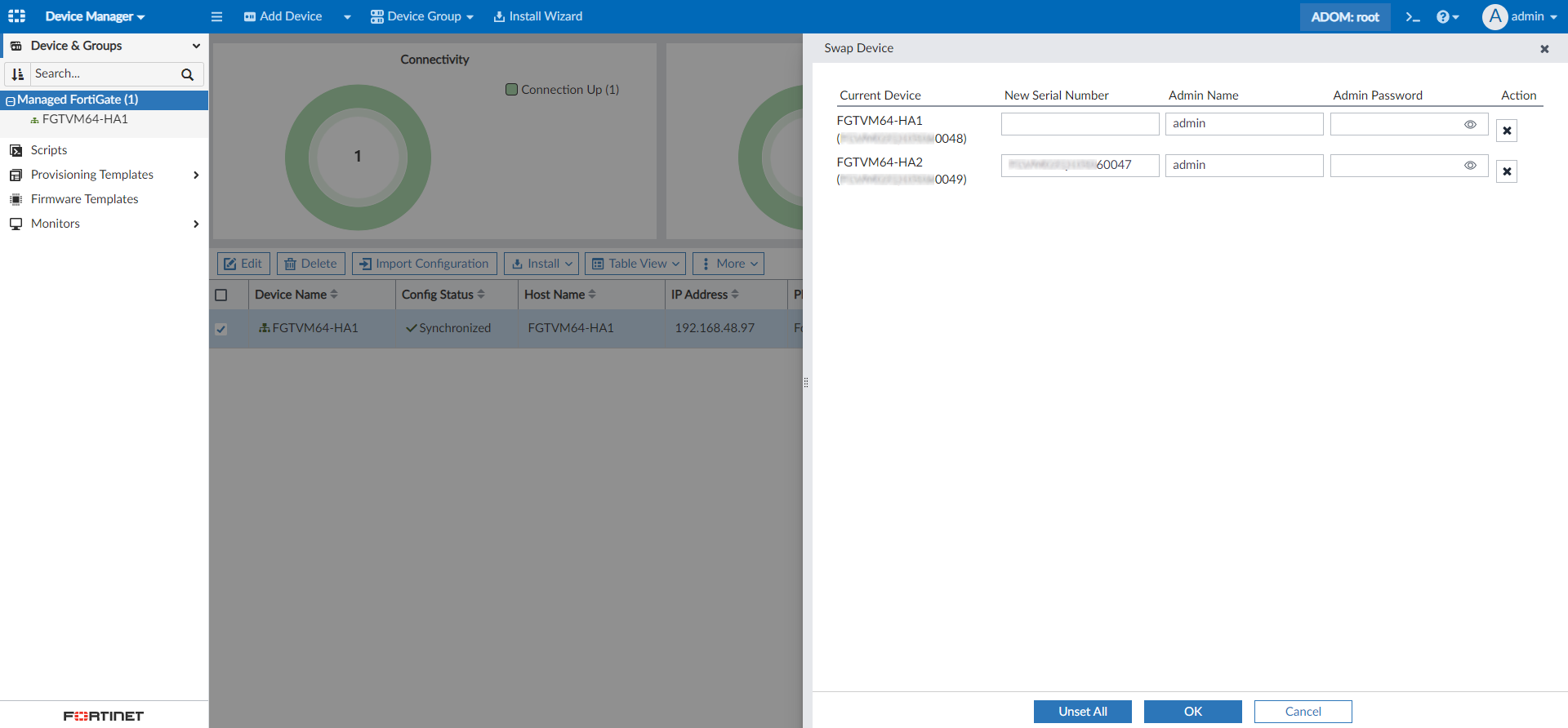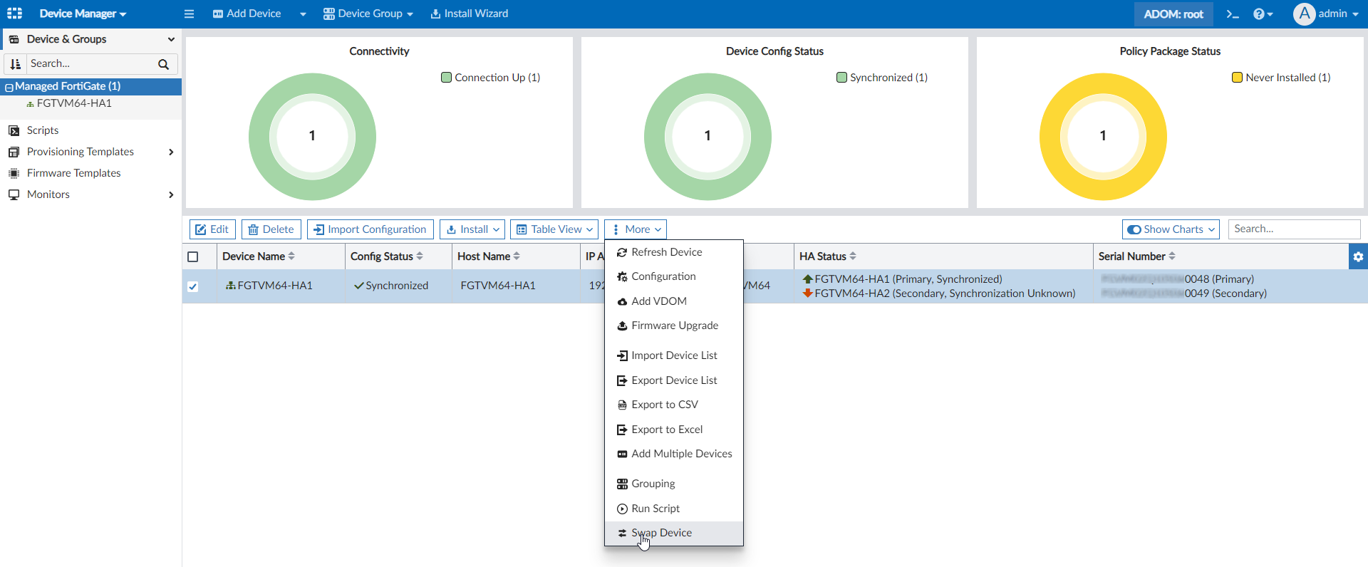 - Select a FortiGate HA cluster from the table and then select More > Swap Device from the dropdown menu.