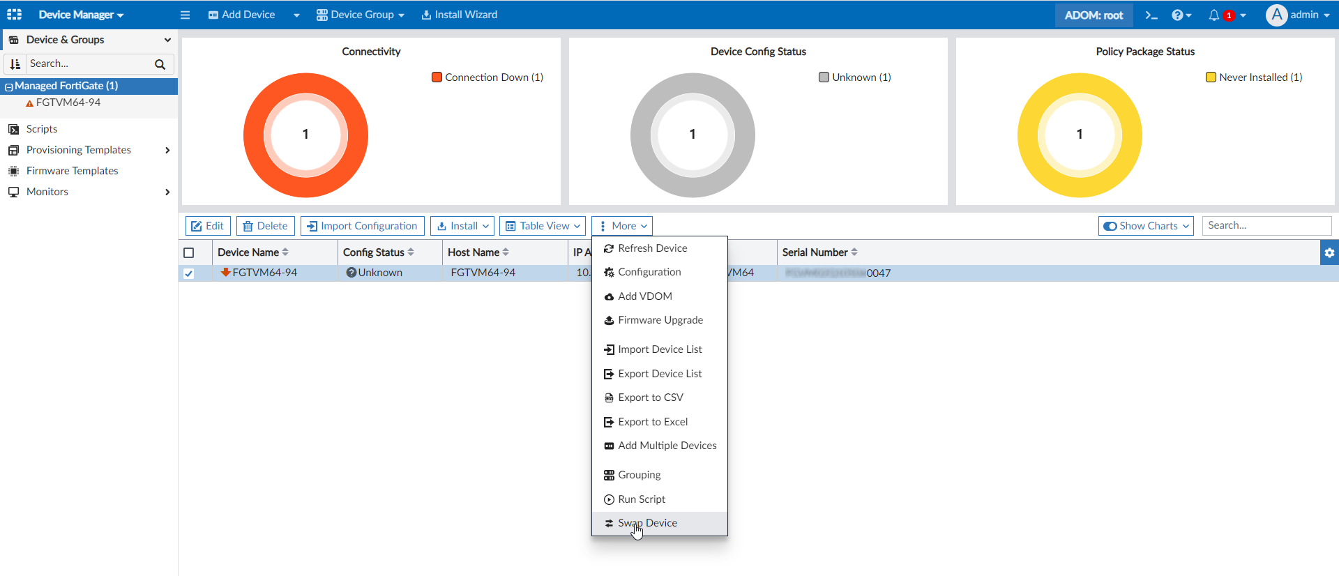 - Select a FortiGate device from the table and then select More > Swap Device from the dropdown menu.