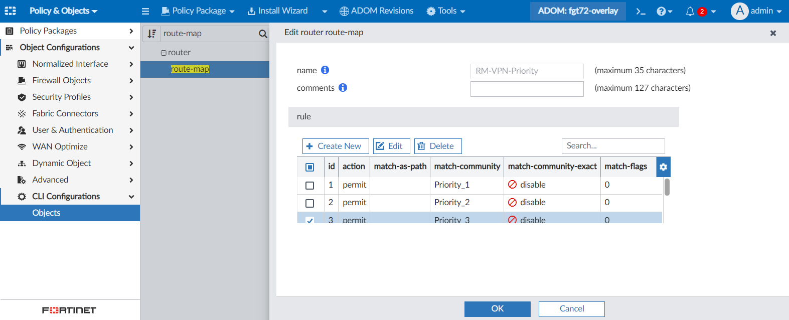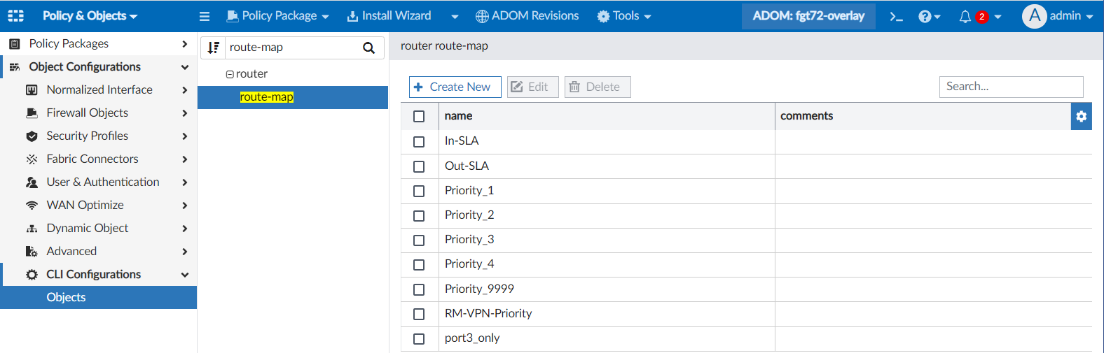FortiManager 7.2.2 includes pre-built route-maps used for SD-WAN self-healing with BGP routing.