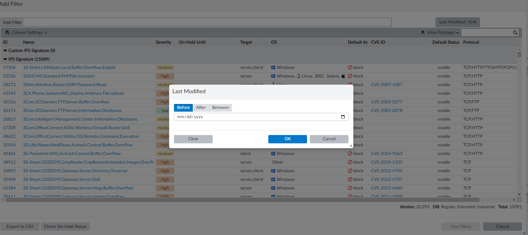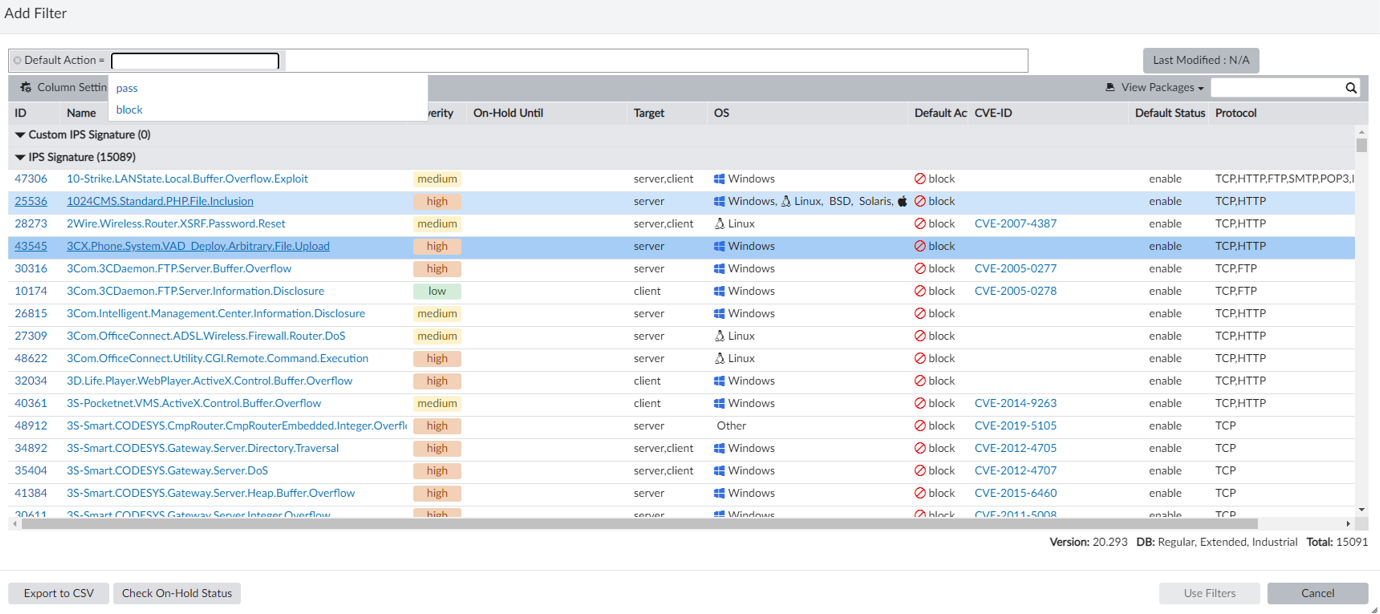 Additional IPS filters are available including Default Action, Default Status, Vulnerability Type, and Last Modified.