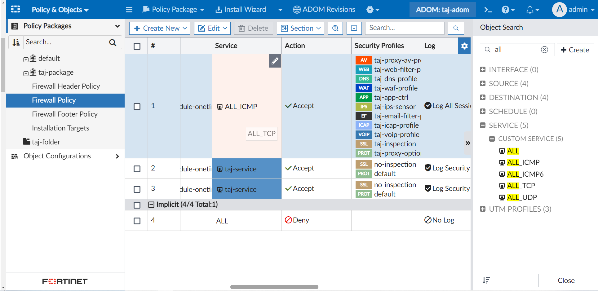 - Users can assign objects from the search panel to a policy by dragging and dropping the object into the corresponding column. FortiManager only supports the drag-and-drop object feature when the object is placed in the column of the came category. In the example below, the ALL_TCP Service object is drag-and-dropped into the Service column for the policy.