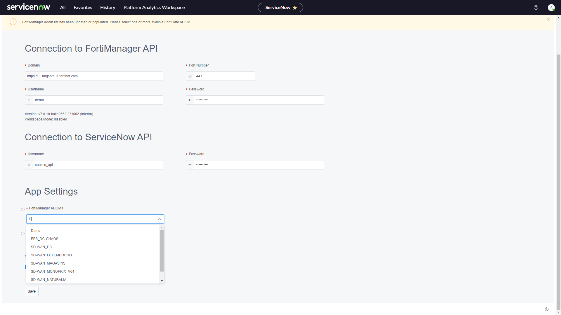 Under App Settings > FortiManager ADOMs, select the ADOM that you want to use from the populated list, and click Save.