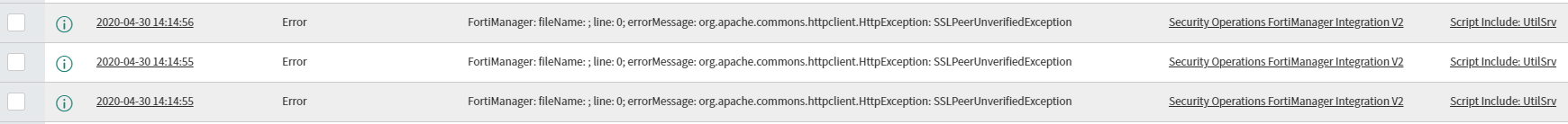 Check that the FortiManager is missing a certificate, or if the certificate is incomplete. ServiceNow requires a trusted certificate on FortiManager to establish a secured connection.