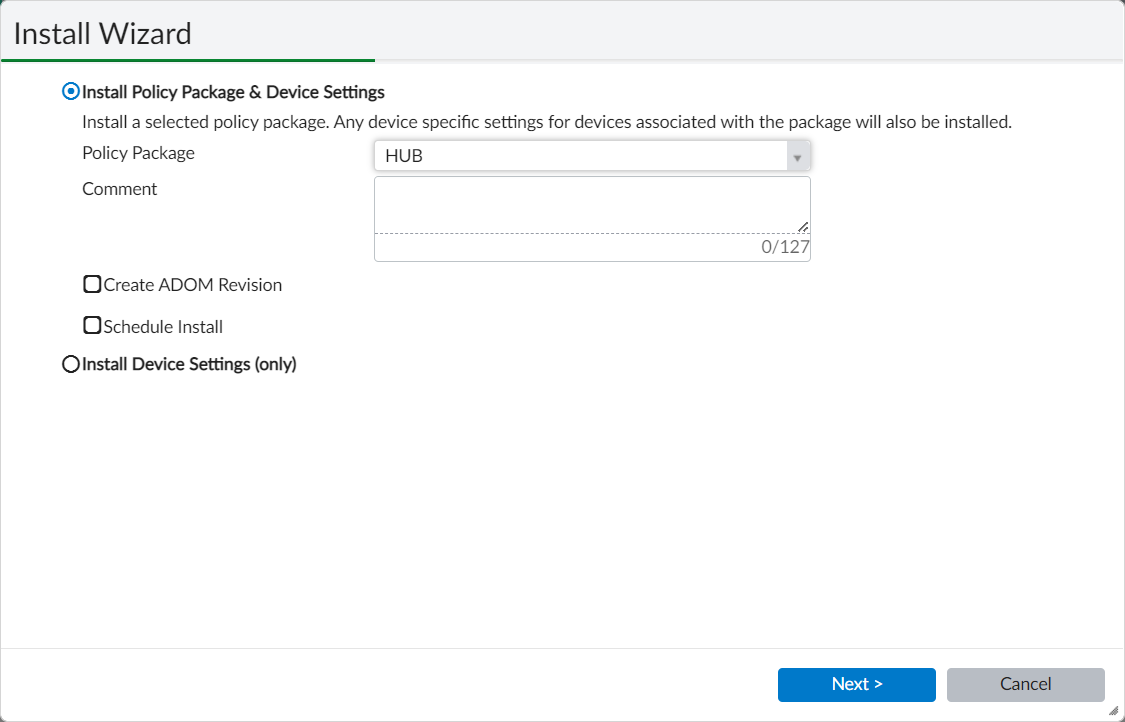 - Install the HUB policy package to the HUB1 device. See Installing the HUB policy package.