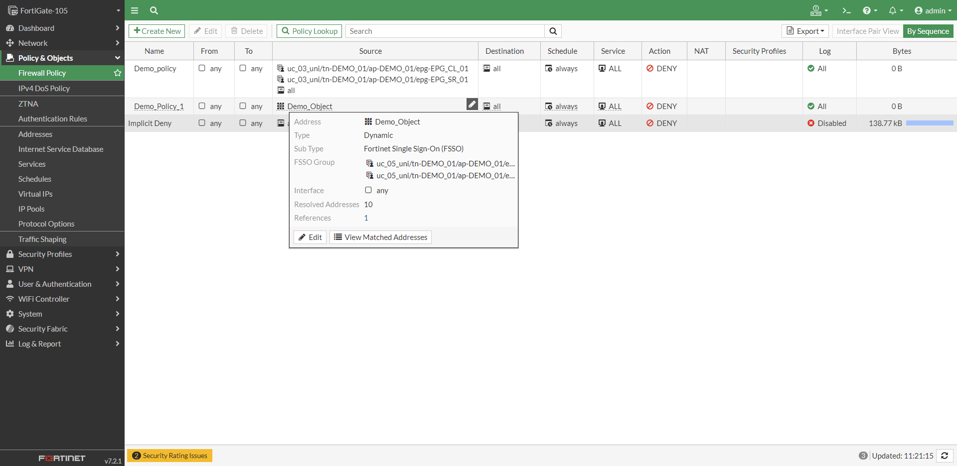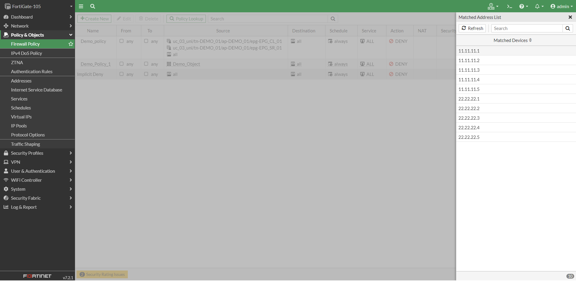 - If the EPGs are in use in Policy and or Address Objects, these FSSO groups will be stuck on FortiManager. Administrators will need to make sure that all the EPG groups in use should be deleted before deleting the connector.