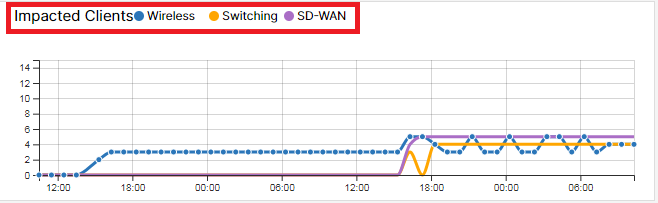 - A toggle option is added for all the impacted SLA panels in the wireless, switching, and SD-WAN dashboards that allows you to toggle between the impacted client count and the impacted device/interface count.