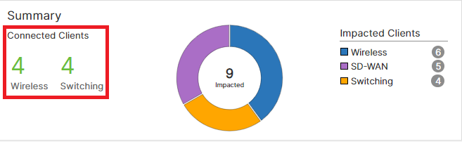 - Click on the connected client count in the Summary or Top 3 Impacted Sites panels to view the client details.