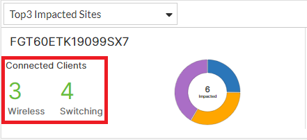 - Clicking on the impacted clients donut charts in the Summary or Top 3 Impacted Sites panel, redirects you to the Impacted Devices page.