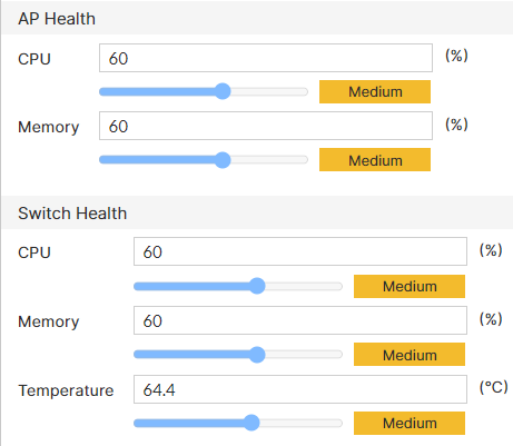 Configure AP and switch health SLA threshold values. The AP health is displayed in the AP Health and Uptime SLA of the Wireless section and the switch health is displayed in the Switch Health and Uptime SLA of the Switching section.