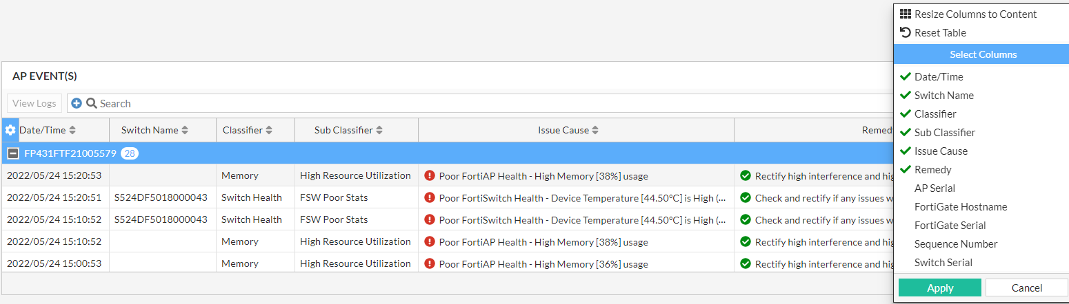 This tab provides the AP event logs generated from FortiGate.