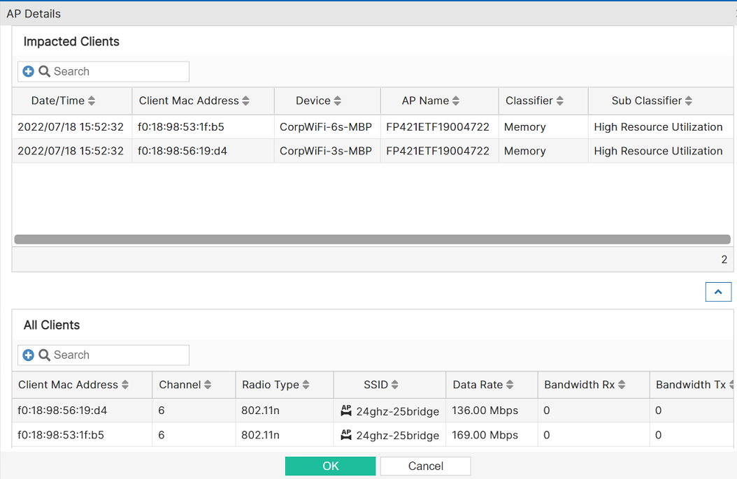 This tab provides details of the impacted clients and also lists all the clients associated with the AP.