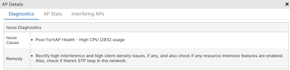 | Issue Cause | detailed cause of the SLA breach that impacted the client/AP/FortiGate. |
