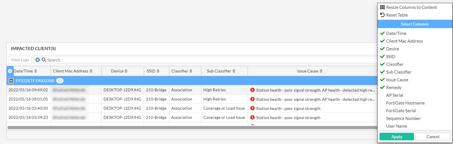 | Client MAC Address | The MAC address of the impacted client device. |