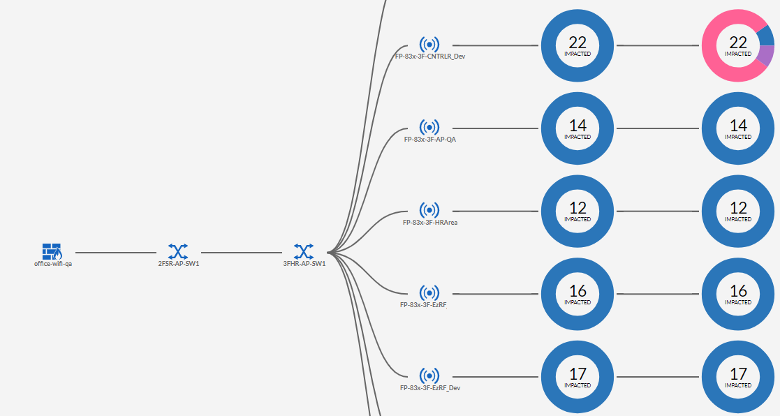 The donut charts in the topology provide the count of the impacted clients associated with each AP. Click on any of these charts to view the impacted client details per AP.