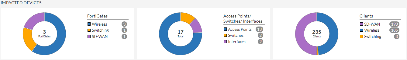 Displays the number of deployed FortiGate controllers with impacted wireless, switching, and SD-WAN clients.
