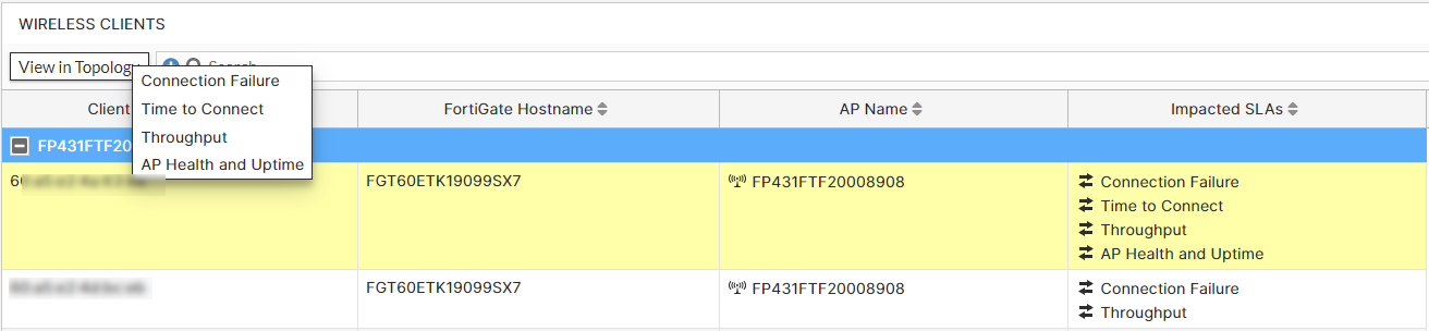 The following example displays the Wireless Clients with information such as the FortiGate host name, serial number, and IP address, AP name and IP address, client MAC address, and the impacted SLAs. Select any row and click View in Topology to view the associated details.