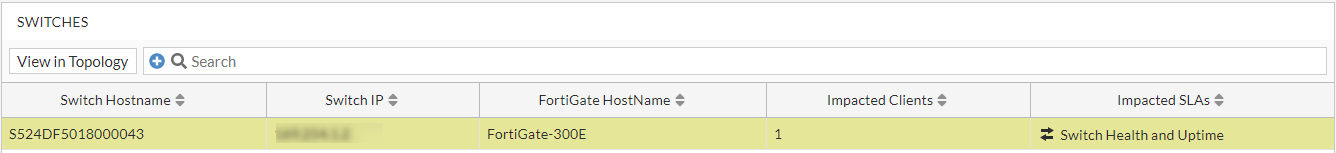 The following example displays the Switches with information such as the switch host name, IP address, OS version, and serial number, FortiGate host name, serial number, and IP address, and lists the impacted clients and SLAs along with the status and state of the switch. Select any row and click View in Topology to view the associated details.