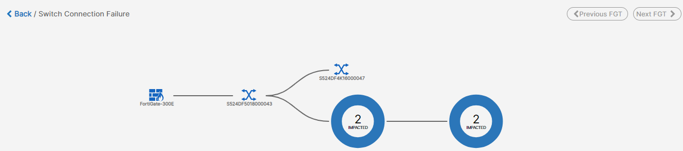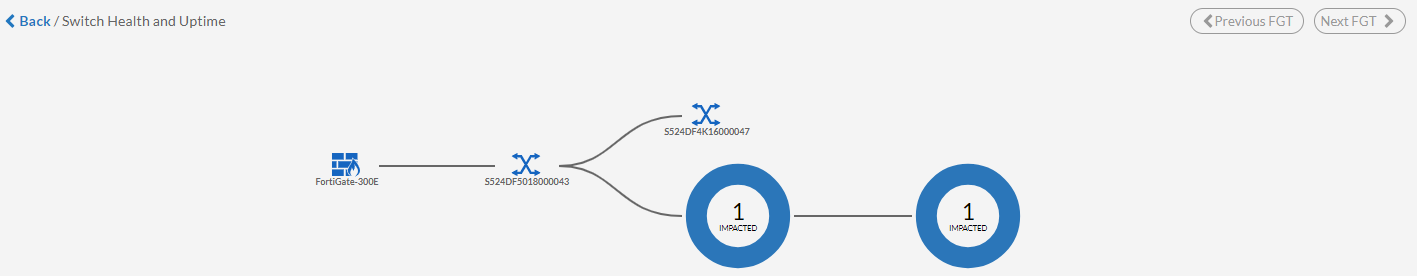 Displays the switch health based on the configured switch health threshold values and the status of the switch (Up/Down). The associated impacted FortiGate controller, switch, and client count are displayed in a collapsible topology.