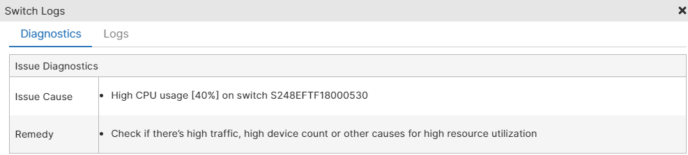 Select a particular switch and click View Logs, the issue diagnostics and the suggested remedy are displayed.
