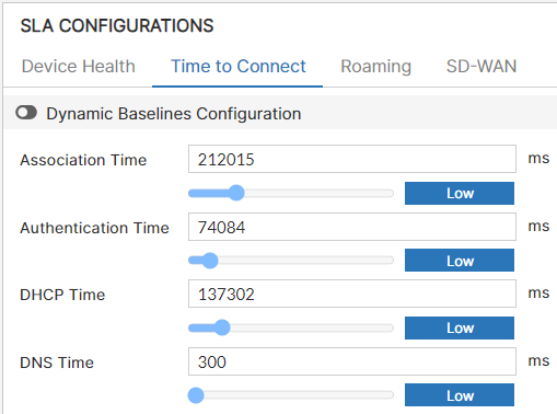 You can configure static thresholds or enable FortiAIOps to compute them dynamically. Based on the configured thresholds, the variations in the time to connect are recorded for each phase, and the statistics are displayed in the Monitor tab.