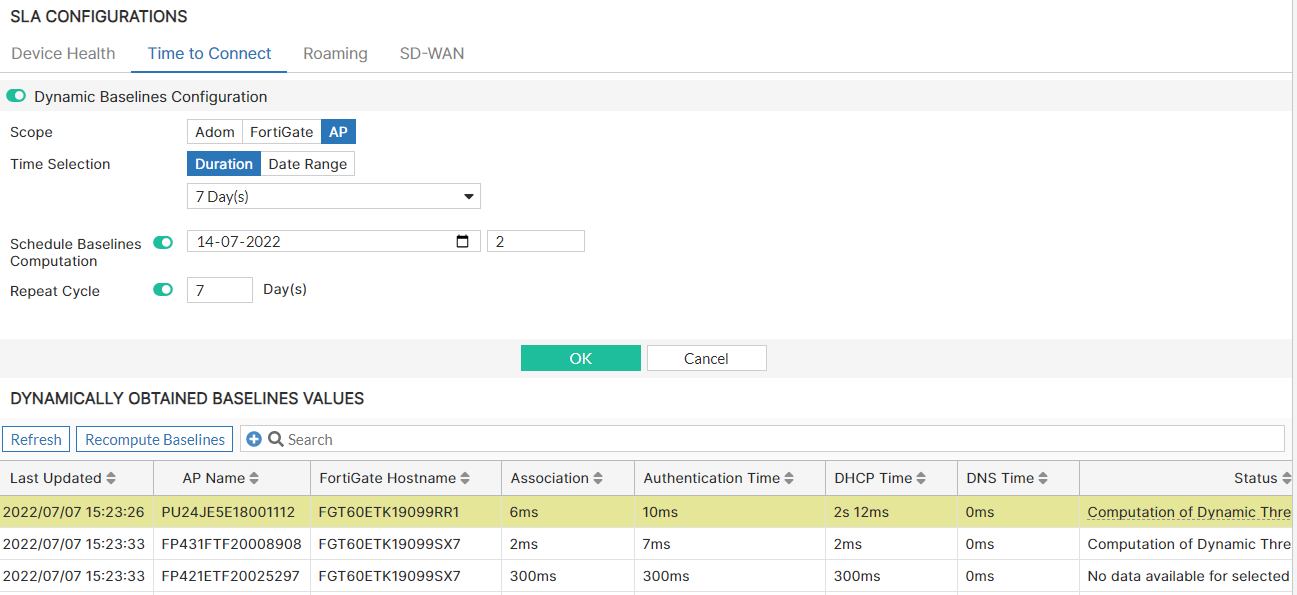 - Schedule Baselines Computation - Set the time when FortiAIOps calculates the baselines and applies them to your network to obtain and report the relevant SLAs.