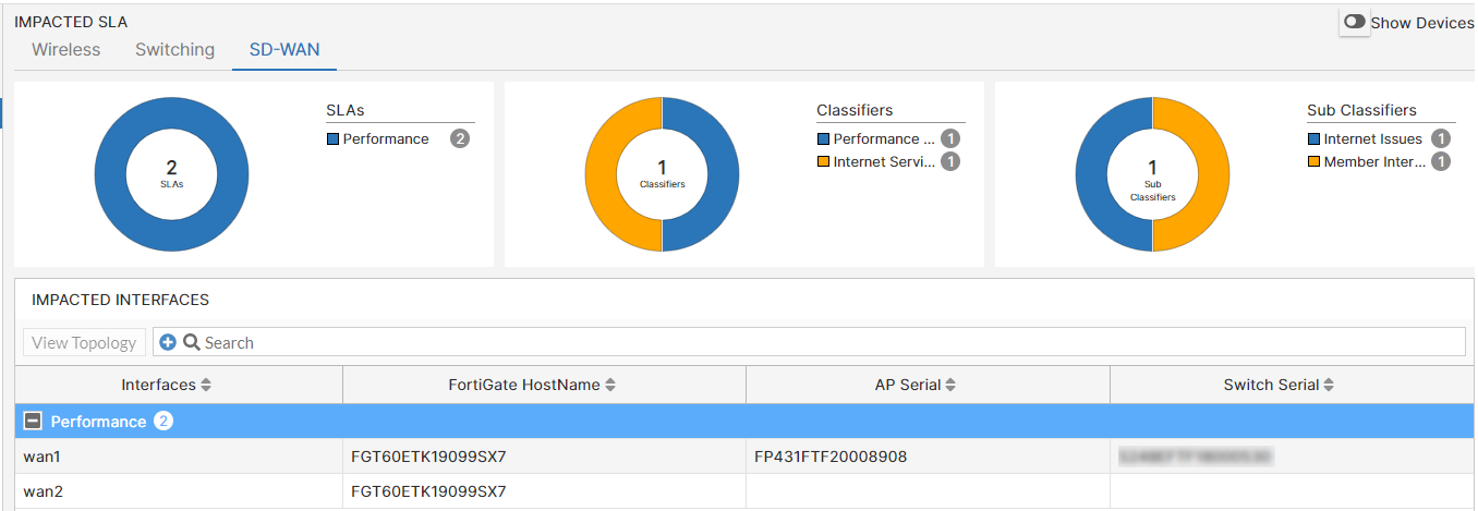 Select any device listed in the Impacted Devices table and click on View Topology for topology and other details. For details on the SLAs, topology, and logs, see section Overview.