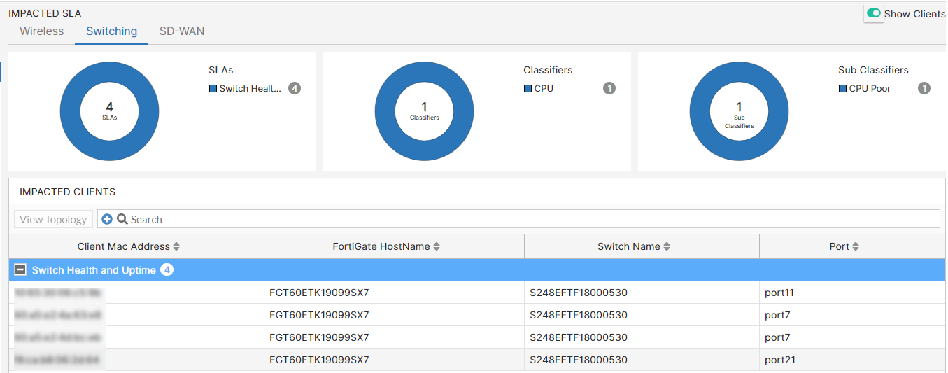 This page displays the impacted wireless, switching, and SD-WAN clients, categorized based on their SLAs, classifiers, and sub-classifiers. Select any SLA and the associated classifier and sub-classifier charts are displayed. You can filter and view the SLAs as per any of these categories. In each impacted SLA panel for wireless, switching, and SD-WAN, you can select Show Clients to view the impacted client count or click Show Devices to view the impacted device count. Navigate to Monitor > Impacted SLA.