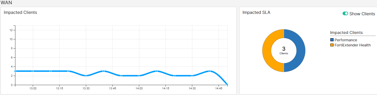 The WAN panel displays the Impacted Clients information for Performance SLA and FortiExtenders failures. Any client that breaches the configured SLA thresholds are reported. In each SLA panel, you can select Show Clients to view the impacted client count or click Show Interfaces to view the impacted interface count.